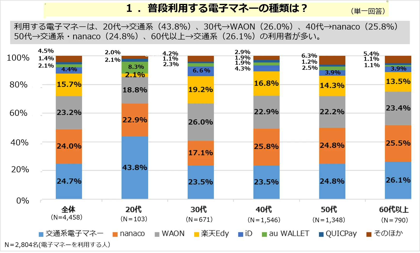 年代別でみると、20代は「交通系(43.8%)」、30代は「WAON(26.0%)」、40代は「nanaco(25.8%)」、50代は「交通系・nanaco(ともに24.8%)」、60代以上は「交通系(26.1%)」の利用率が高いことがわかった。
