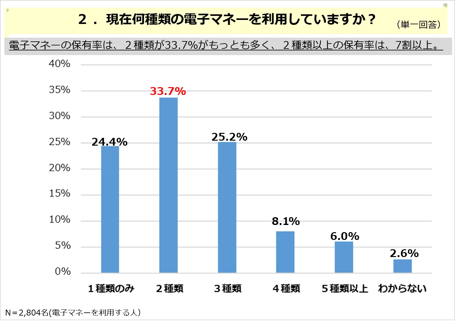電子マネーの保有率は、「2種類」が33.7%でもっとも多く、「3種類」が25.2%、と続き、2種類以上の保有率は7割を超える結果となった。