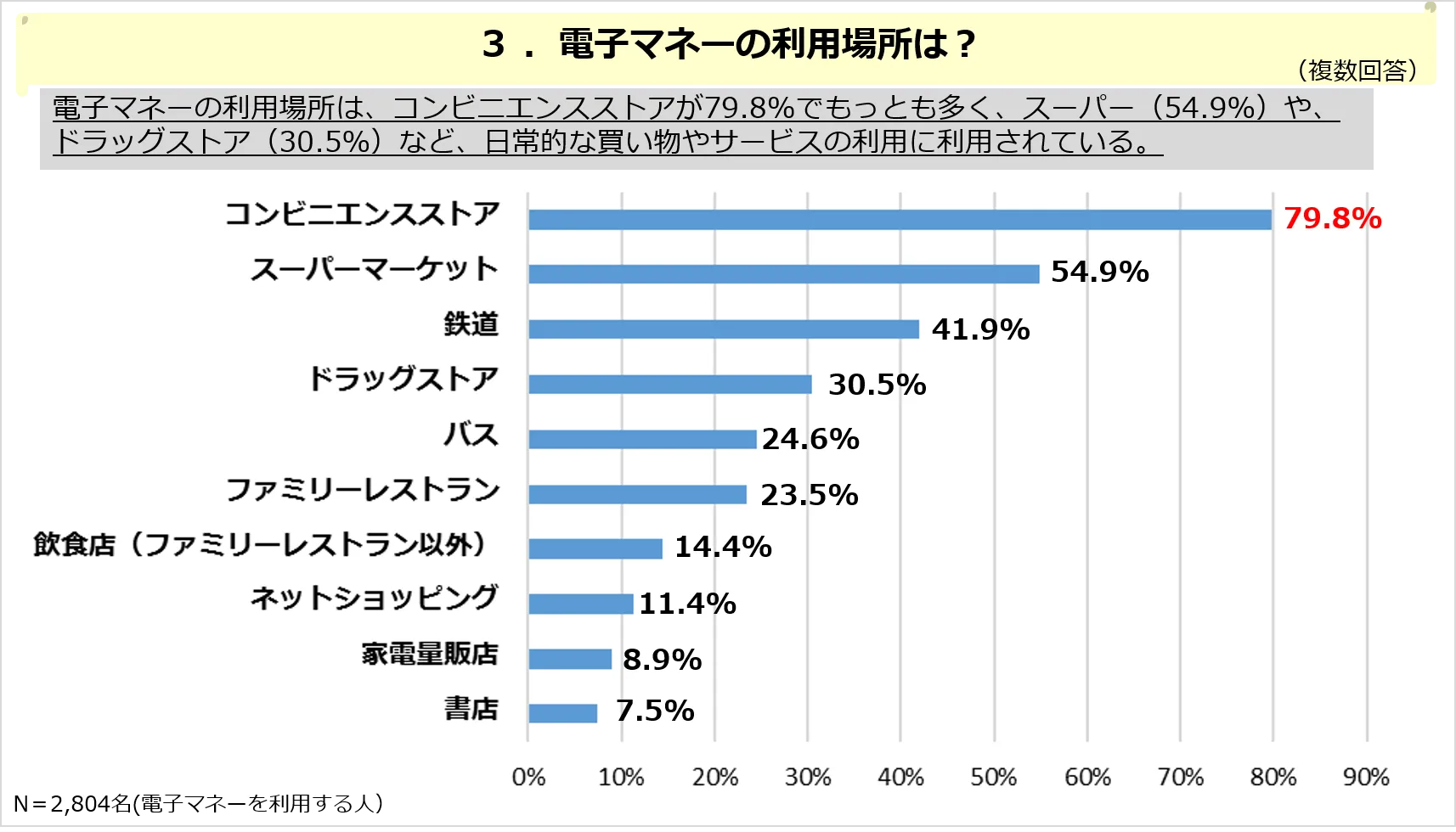 実際の利用場所は、「コンビニエンスストア」が79.8%でもっとも多く、「スーパー(54.9%)」や、「ドラッグストア(30.5%)」、「ファミリーレストラン(23.5%)」でも利用されており、電車やバスなどの乗車券としての利用だけではなく、日常的な買い物やサービスに電子マネーを利用している。