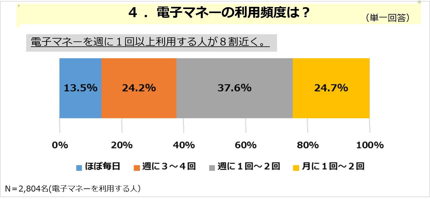 電子マネーの利用頻度は、「週に1~2回」が37.6%でもっとも多く、「ほぼ毎日利用(13.5%)」、「週に3~4回(24.2%)」と合わせると、8割近くが週に1回以上利用している。