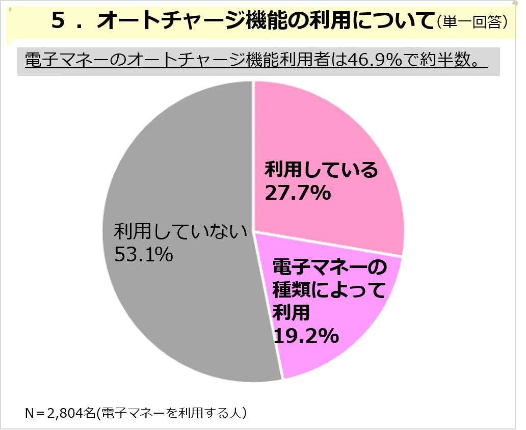 電子マネーのオートチャージ機能の利用については、「利用している」が27.7%で、「電子マネーの種類によって利用している」が19.2%、「利用していない」が53.1%となった。