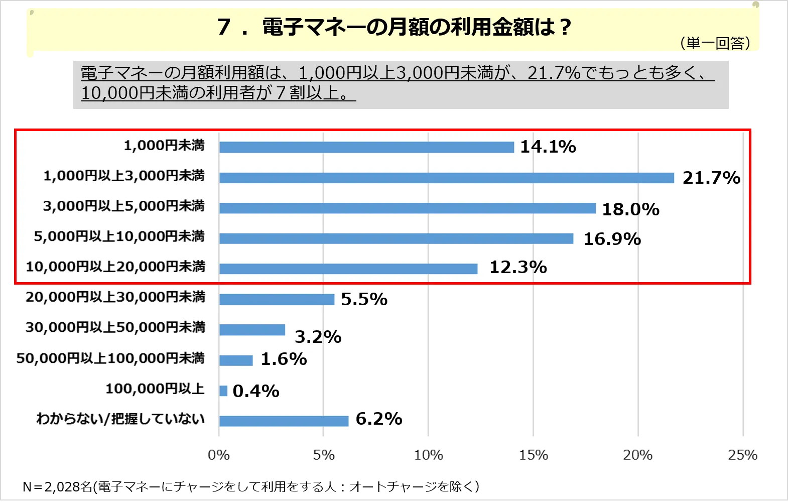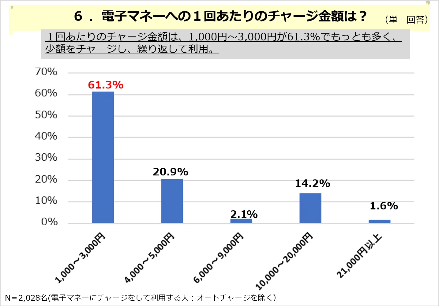 まず1回あたりのチャージ金額は、「1,000円~3,000円未満」が61.3%で半数以上を占め、月額の利用料金をみても、約7割以上が、10,000円未満という結果となり、少額をチャージし、繰り返して利用するケースが多いことがわかった。
