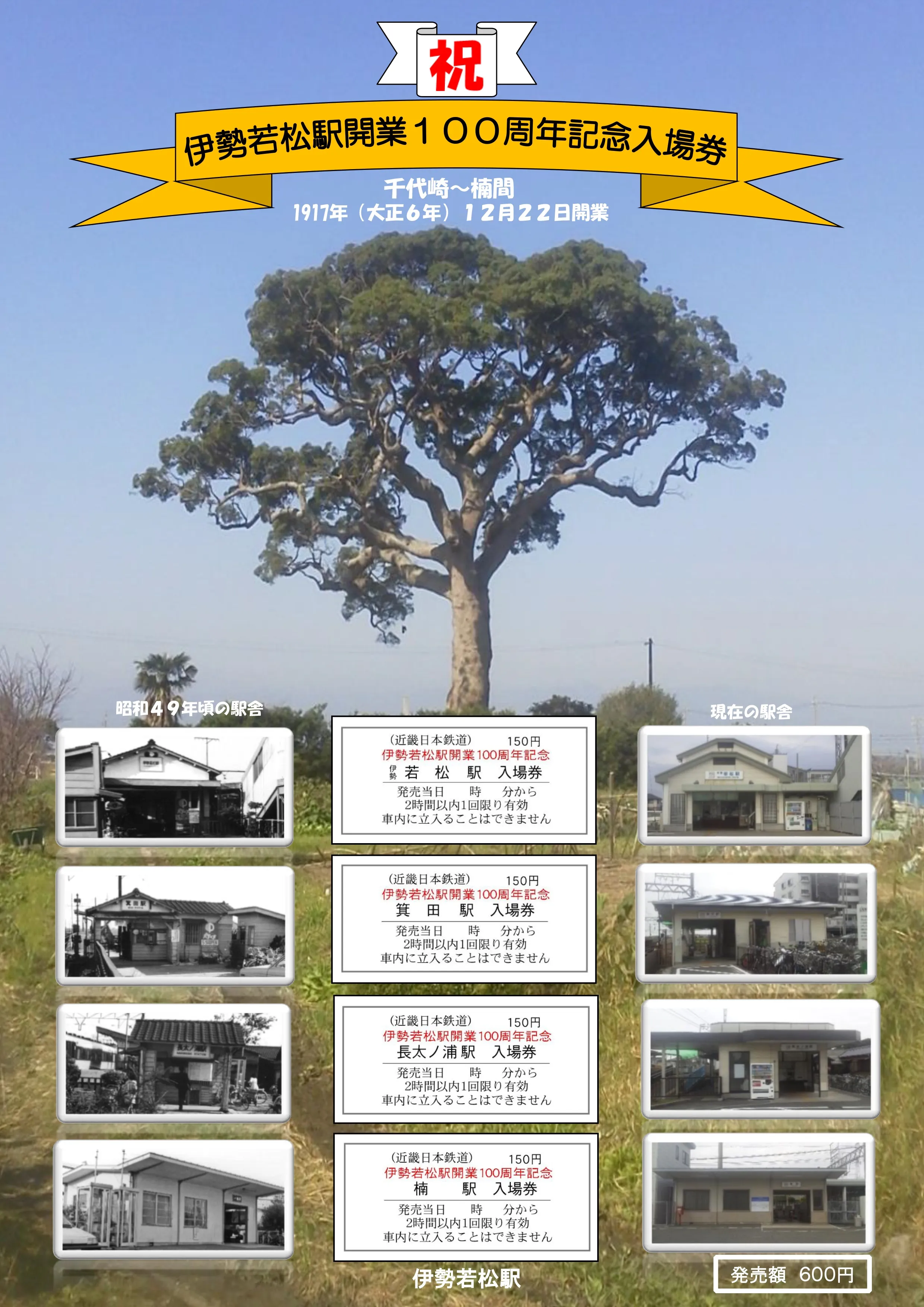 記念入場券は、伊勢若松駅と同時に開業した箕田駅(みだえき)、長太ノ浦駅(なごのうらえき)、楠駅(くすえき)をセットにして、500セット限定(600円)で発売します。この記念入場券は、箕田駅~長太ノ浦駅間の西側にそびえ立つ「長太の大楠」(三重県指定天然記念物)を背景に、現在と昭和49年ごろの駅舎の写真を載せた専用台紙に「伊勢若松駅開業100周年記念」の文字を印刷したものです。