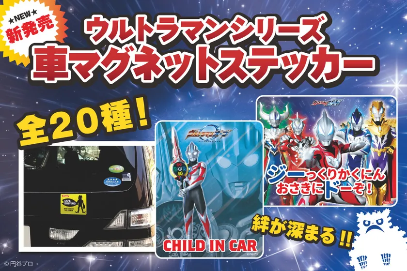 商品デザインはウルトラヒーローや怪獣と、「SAFE DRIVING」「CHILD IN CAR」などのフレーズを組み合わせた全20種をラインナップしました。