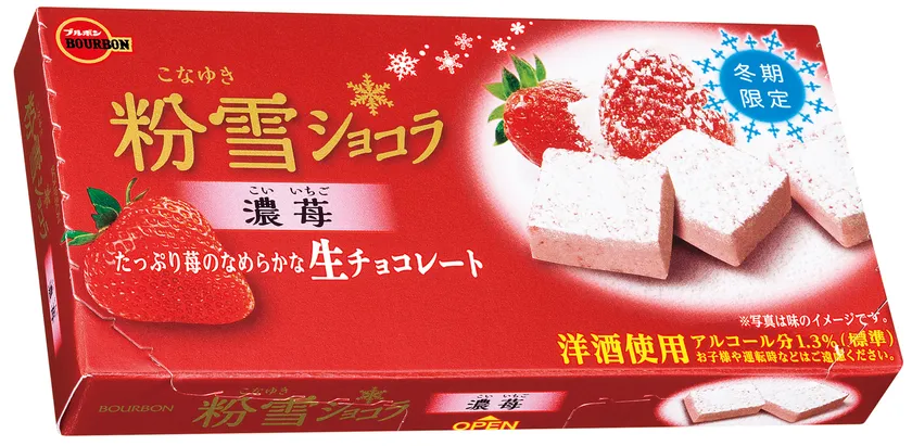株式会社ブルボン(本社:新潟県柏崎市、代表取締役社長:吉田 康)は、冬期にしか味わえないたっぷり苺のなめらかな生チョコレート「粉雪ショコラ濃苺」を2018年1月9日(火)に期間限定で新発売いたします。