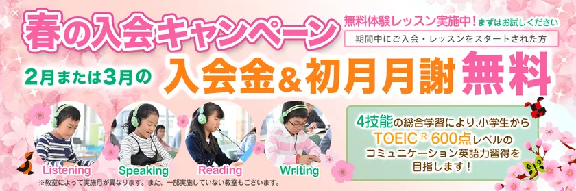 ・月謝の無料特典は、2月または3月のレッスンのみ対象です。2月または3月の途中や後半に入会された場合も、2月または3月の月謝の無料特典を翌3月、または翌4月以降に繰り越すことはできません。あらかじめご了承ください。