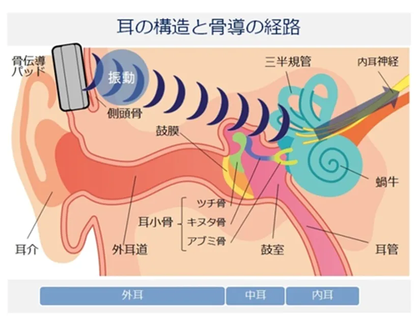 耳の聞こえが良くない方(伝音難聴)に効果が見込めると言われています。伝音難聴とは外耳道、鼓膜、耳小骨に異常があり音がうまく伝わらない事が原因の難聴です。このため内耳に直接音を伝える骨伝導は効果が見込めます。