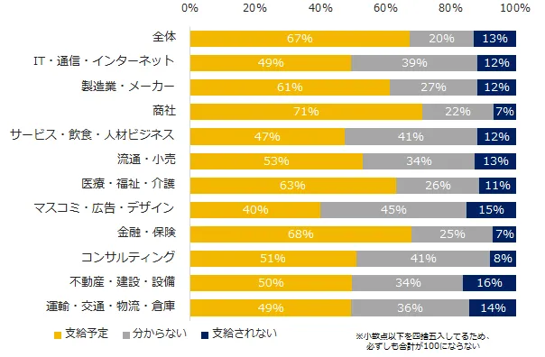 正社員として勤務している方に「今年の冬のボーナスは支給予定ですか?」と質問をしたところ、67%の方が「支給予定」と回答しました。企業規模が大きくなるほど支給率は上がる傾向が見られ、「1001名以上」の企業に在籍する方は85%が「支給予定」のようです。業種別の支給率は、第1位が「商社」(71%)、第2位が「金融・保険」(68%)、第3位が「医療・福祉・介護」(63%)でした。