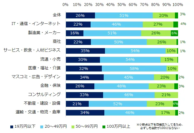 冬のボーナス支給額の最多回答は「20~49万円」(51%)でした。「50万円以上(50~99万円、100万円以上)」は、23%です。支給額も企業規模と比例して高くなる傾向が見受けられます。「50万円以上」の回答が全体より5ポイント以上高い業種は、「製造業・メーカー」(32%)、「IT・通信・インターネット」(31%)でした。
