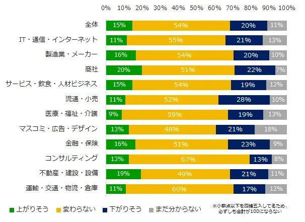 「昨年と比較した支給額」を質問しました。「上がりそう」の回答は15%に留まり、「下がりそう」(20%)が上回りました。規模・業種別でも、すべてにおいて「下がりそう」が「上がりそう」を上回る結果でした。「上がりそう」と回答した方が所属する業種のトップ3は、「商社」(20%)、「不動産・建設・設備」(19%)、「製造業・メーカー」「金融・保険」(16%)。「下がりそう」の回答がもっとも多かったのは「流通・小売」(28%)の方でした。
