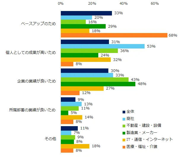 「上がりそう」と回答した方に、上がる理由を伺いました。全体では「ベースアップのため」(33%)「個人としての成果が高いため」(31%)「企業の業績が良いため」(30%)が横並びになりましたが、こちらも業種別に違いが見受けられます。