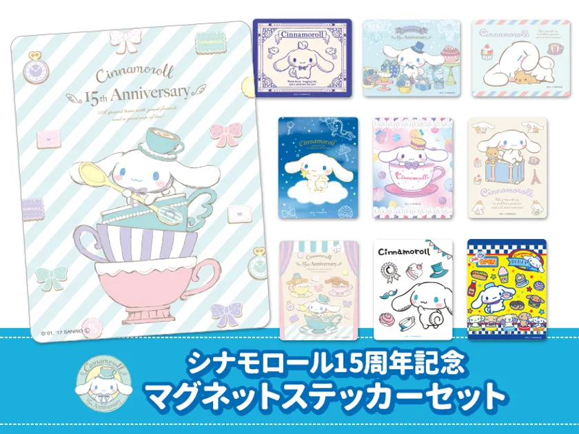 購入特典の15周年記念デザイン収納ホルダーに入れて眺めるのを楽しんだり、車に貼ってシナモンと一緒に出かけたり、家庭の冷蔵庫や玄関ドアに貼って飾ったりと、人それぞれの楽しみ方でシナモロールのデビュー15周年記念をお祝いしましょう。
