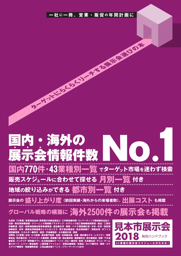 2018年1月から12月までに開催される見本市展示会を月別・都市別・業種別に掲載。国内で開催予定の大型商談展(770件)を網羅し、ビジネス展開の指針を立てることができます。都市別では北海道から沖縄までをもれなく情報収集。隔年開催などで今年開催されない展示会については2019年以降のスケジュールも掲載しています。