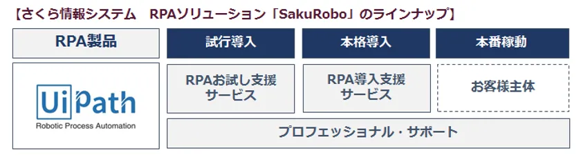 さくら情報システム株式会社(本社:東京都港区、代表取締役社長:池尻 和生、以下:さくら情報システム) は、米UiPath(日本法人:UiPath株式会社、本社:東京都千代田区、以下:UiPath社)が提供するRPA(ロボティック・プロセス・オートメーション)ツール「UiPath」を利用したRPAソリューション「SakuRobo」の提供を開始します。さくら情報システムは、「UiPath」の試行導入から本格導入までサポートします。