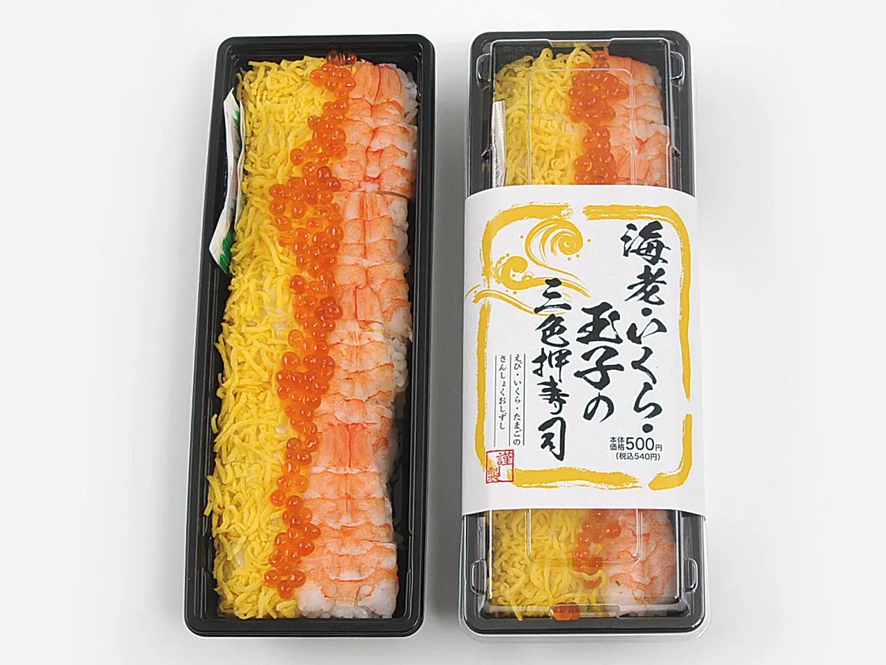 今回、チルド寿司の新たなラインアップとして見た目にも華やかな「海老・いくら・玉子の三色押寿司」を発売します。ちょっと豪華な昼食や、人が集まるホームパーティー、年末年始のごあいさつの手土産にもおすすめの商品です。