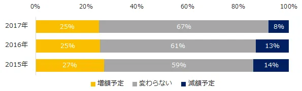 今年、冬季賞与を支給予定の従業員数299名以下の企業に「昨年の冬季賞与支給額と比較して、今年の支給予定額に変動はありますか?」と伺ったところ、「増額予定」(25%)が「減額予定」(8%)を上回りました。2015年の調査から3年連続で、増額予定の企業が減額予定を上回っています。