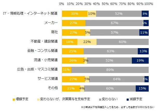 「増額予定」と回答した割合が高い業種トップ3は「IT・情報処理・インターネット関連」(30%)、「メーカー」「サービス関連」(27%)となりました。「変わらないが、決算賞与を支給予定」という回答も「不動産・建設関連」は22%、「IT・情報処理・インターネット関連」も10%で、高業績を報酬で還元する企業が多いことがうかがえます。