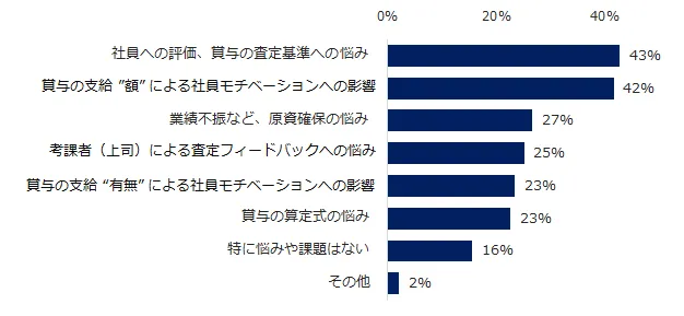 社員への賞与支給に関する悩みを伺いました。第1位は「社員への評価、賞与の査定基準への悩み」(43%)、第2位は「賞与の支給 ”額” による社員モチベーションへの影響」(42%)でした。