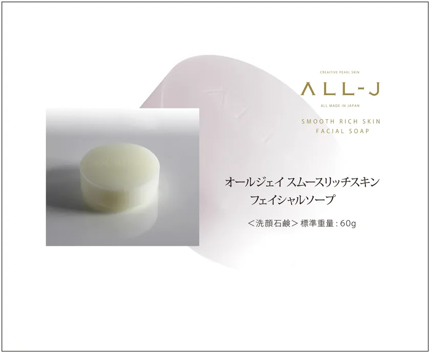 「ALL-J SMOOTH RICH SKIN FACIAL SOAP」は、毛穴に詰まった汚れを、ねばり気のある泡ですっきり洗える洗顔せっけんです。キメが細かく糸を引くほどねばり気のある密着泡で、毛穴の奥の老廃物や汚れを浮かしてからめとります。洗い上がりはしっとり、毛穴の奥の老廃物や汚れを落とすことによる透明感のある肌に。日本製の石鹸素地の泡立ちを最大限まで引き出しつつ、リッチなとろみ泡を実現し、吸着保湿成分(ジヒドロキシプロピルアルギニンHCl)で洗い上がりしっとりとしたお肌になります。