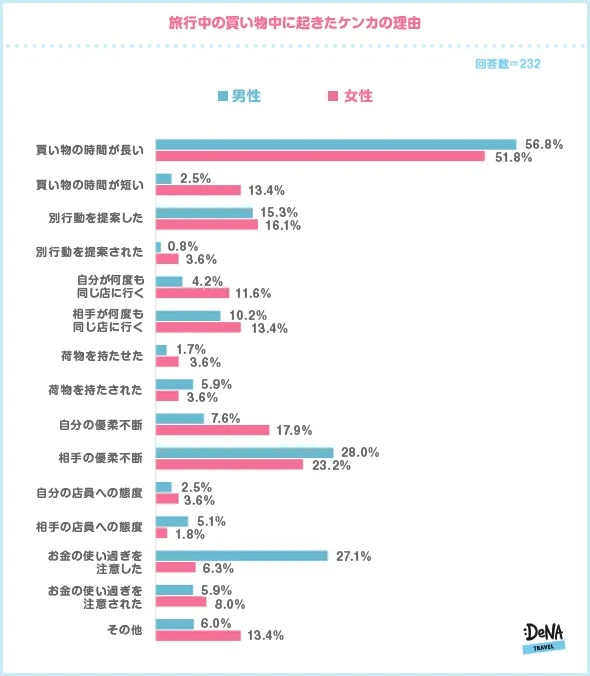 ケンカの理由を男女別に集計すると、どちらも最も多かったのは「買い物の時間が長い」(男性56.8%、女性51.8%)でした。調査2での男女の買い物時間の差を考えると、女性の買い物時間の長さに男性が不満を言い、ケンカとなっているケースが多そうです。男女で回答数に大きな開きがあったのが「お金の使い過ぎを注意した」(男性27.1%、女性6.3%)。旅行に行くとついついお金を使いがちですが、女性は男性の前での散財は控えたほうが良いかもしれません。「自分が何度も同じ店に行く」(男性4.2%、女性11.6%)や「自分の優柔不断」(男性7.6%、女性17.9%)などは普段の買い物でもありがちな男女差ですが、旅行中という特別なシチュエーションだからこそ気を付けたいものです。