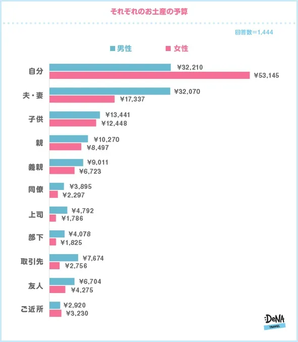 お土産を買う相手を男女別に集計したところ、男女共に最も多かったのは「自分」(男性68.1%、女性88.4%)。全体的に男性より女性のほうがより多くの人にお土産を渡していることがわかりました。さらにそれぞれの予算を男女別に見てみると、女性は男性よりも「自分」(男性32,210円、女性53,145円)に対して2万円以上多くの予算を持っているのに対し、その他の相手に対する予算はほとんどが男性を下回る結果となりました。