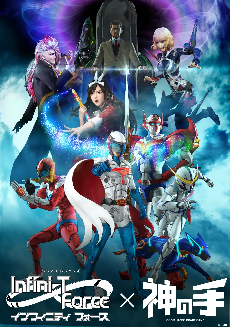 タツノコプロ55周年記念作品としてテレビシリーズで10月から放送されているアニメ「インフィニティ フォース」と、3Dクレーンゲーム「神の手」のコラボ企画がスタートいたしました。本作は1970年代に誕生し、人気を博した科学忍者隊ガッチャマン、宇宙の騎士テッカマン、破裏拳ポリマー、新造人間キャシャーンのタツノコプロ4大ヒーローが共演を果たしているフル3DCGアニメで、来年2月には劇場版公開も予定されている、話題の作品です。