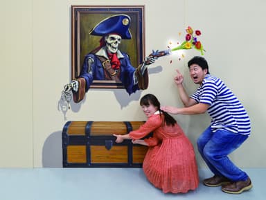 この作品は、宝箱を守っている描かれた骸骨が突然動き出します。侵入者をピストルで攻撃しはじめますが、花が出たり、自分の首が飛んで行ったりと、コミカルな映像も見ることが出来ます。見ていても十分楽しめますが、モデルとなって骸骨と戦う動画を撮ってお楽しみいただけます。