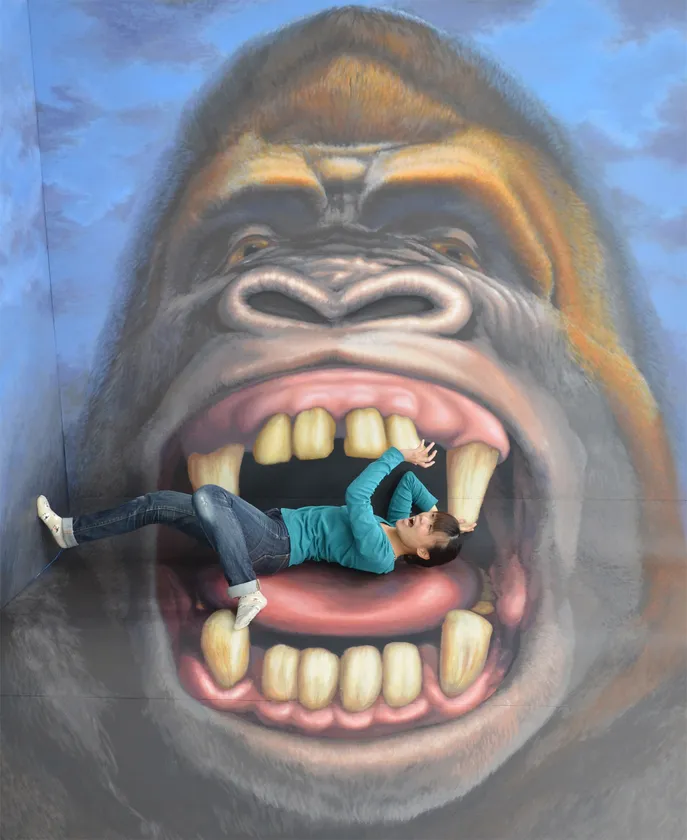 これまでのトリックアート作品における撮影の楽しみ方は作品の前でポーズをとって撮影することで、作品の世界に入り込んだ写真(静止画)を完成させることでしたが、今回は立体構造を使うことで、撮影する場所によって映像(作品の見え方)が変わる仕組みを導入することで、描かれている巨大なゴリラが口を開け閉めする映像を撮ることが出来ます。モデルとなった鑑賞者がまるで食べられてしまうような演技や口を開けて逃げ出すようなポーズをすることで、今まで以上にストーリー性のある驚きの映像をトリックアートでお楽しみいただけます。