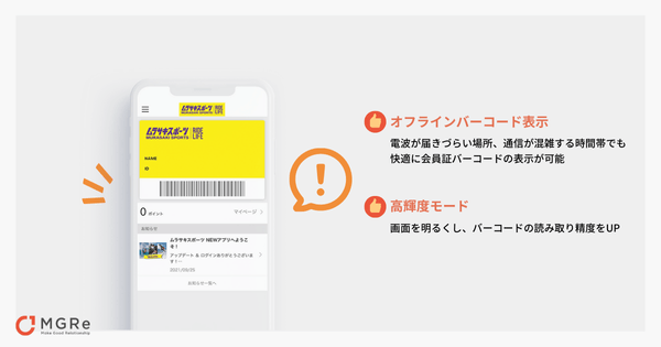 MGReが提供する会員証機能は、オフラインの状態でも会員証バーコードの表示が可能です。