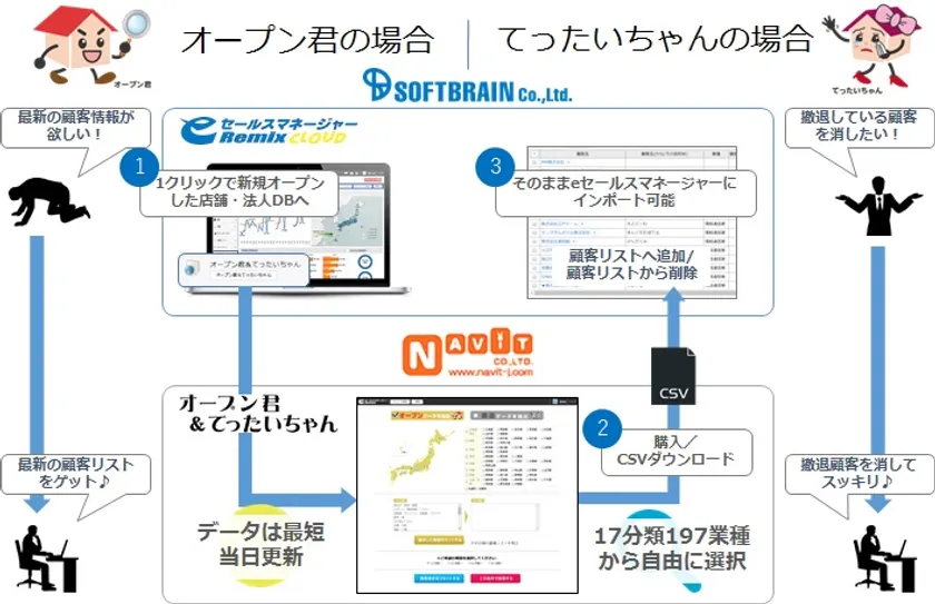 データ・リストの販売、調査代行の株式会社ナビット(東京都千代田区、代表取締役:福井 泰代、以下、ナビット)と、営業課題解決サービスを提供するソフトブレーン株式会社(東京都中央区、代表取締役社長:豊田 浩文、以下、ソフトブレーン)は、店舗・オフィスの新設・撤退情報の「オープン君&てったいちゃん」と使い勝手No.1(*1)の営業支援システム(CRM/SFA)「eセールスマネージャーRemix Cloud(以下eセールスマネージャー)」の連携が完了し、2017年12月21日(木)に提供開始することを発表いたします。