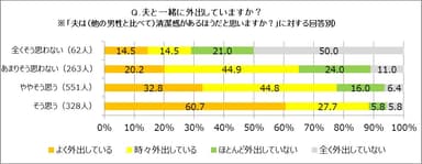 この質問を、(1)の夫の清潔感に関する回答別で集計したところ、夫に「清潔感があるほうだと思う」と回答した層では、夫とよく外出しており(「よく外出している」が60.7%)、清潔感がなくなるにつれて、「よく外出している」割合が顕著に低くなりました。夫に清潔感があると「全く思わない」層では、「よく外出している」はわずか14.5%。反対に、5割もの人が「夫と全く外出していない」と回答しています。