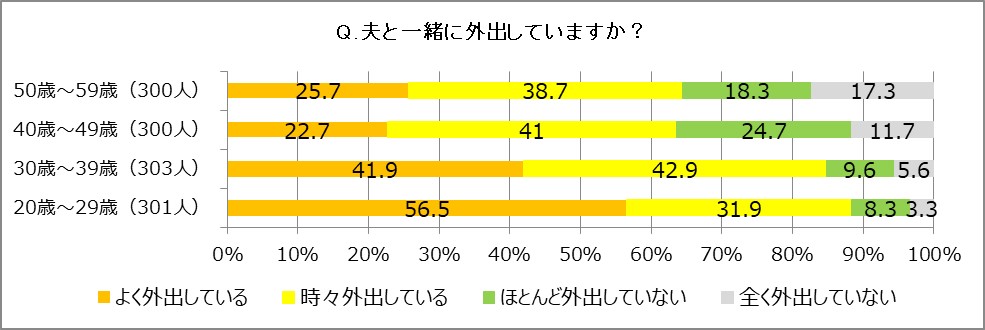 (3) 「夫と一緒に外出していますか?」という問いに対する回答を年代別に見たところ、「よく外出している」という回答は、20代では56.5%、30代では41.9%だったものが、40代では22.7%、50代では25.7%と、年を重ねるほど顕著に減っていくことがわかりました。