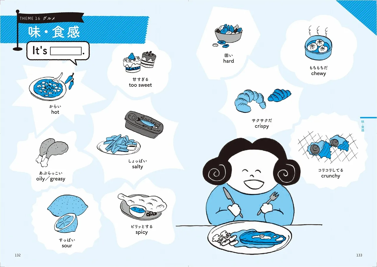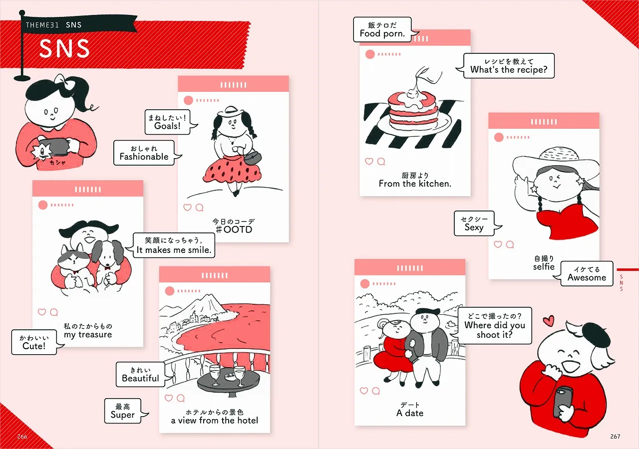 ゆるくて思わずクスッと笑ってしまうイラストで、パラパラと気軽に読める仕様になっています。「こんな時なんて言うだっけ?!」に答える実践的な内容です。