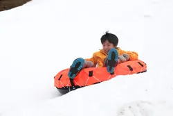 大きなタイヤチューブの形をしたソリで、中央にあるくぼみに腰を下ろして雪面を滑り降りるアトラクションです。