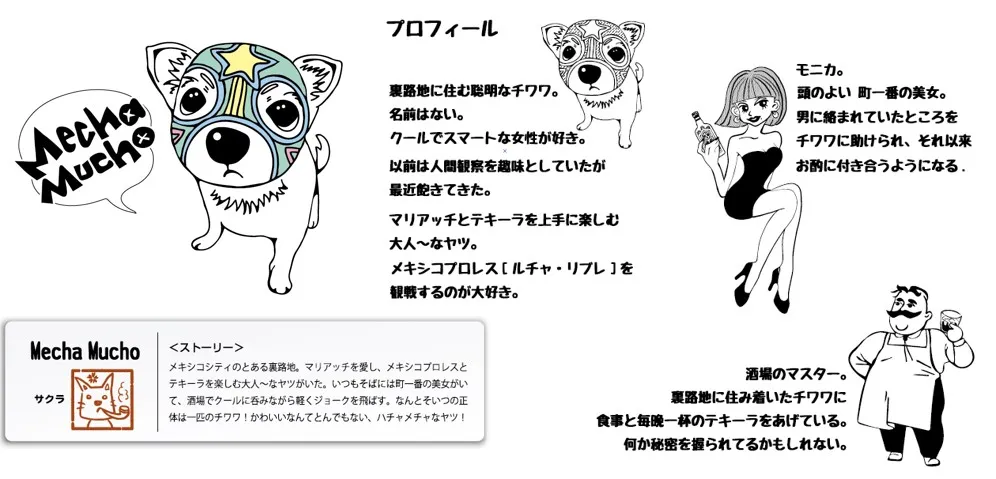 サクラさんがデザインする「Mecha Mucho(メチャムーチョ)」は、メキシコシティのとある裏路地が舞台。酒のみでプロレス好きなハチャメチャなチワワが主人公。