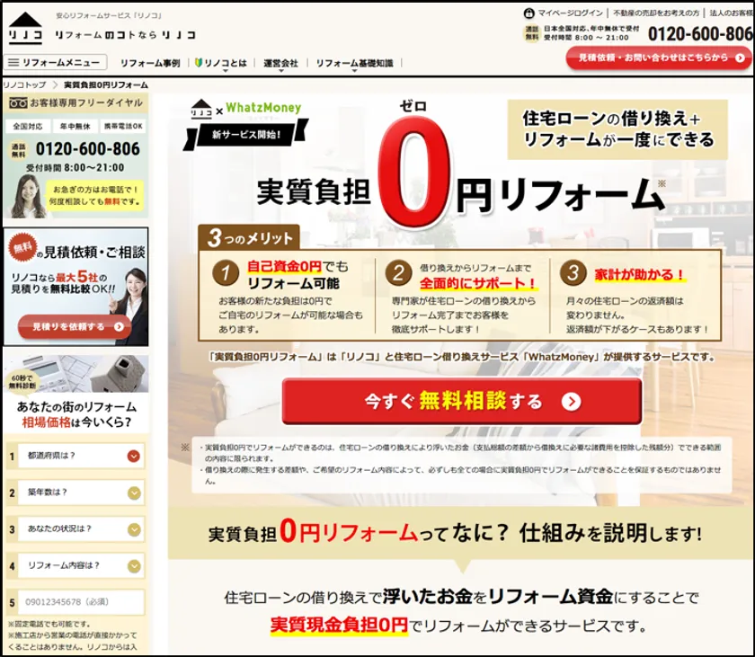 セカイエが運営するオンラインリフォームサービス「リノコ」のサービスサイトにて、借り換えお得額の範囲内でリフォームをすることで実質現金負担0円のリフォームができることを訴求します。