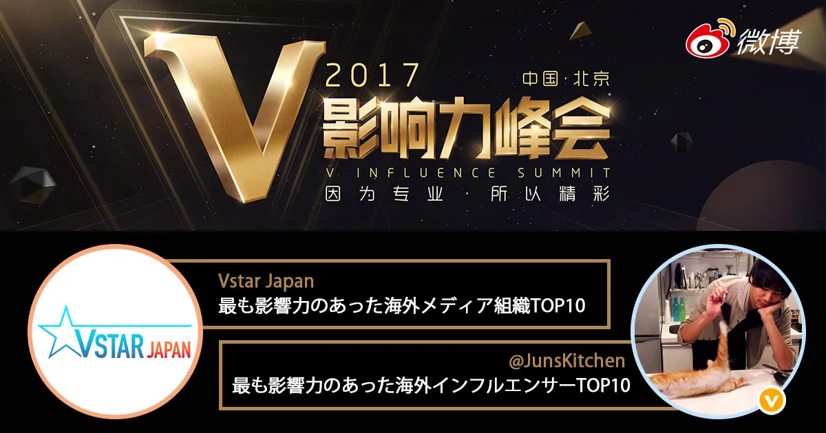 今回、Vstar Japanに所属するクリエイターのWeiboアカウントの影響力があると認められ、今年最も影響力のあった海外メディア組織TOP10として「微博2017十大影響力海外媒体機構」を受賞いたしました。さらに、Vstar Japanが支援している微博(Weibo)アカウント「JunsKitchen」が、今年最も影響力のあった海外インフルエンサーTOP10として「微博2017十大影響力海外大V」を受賞いたしました。