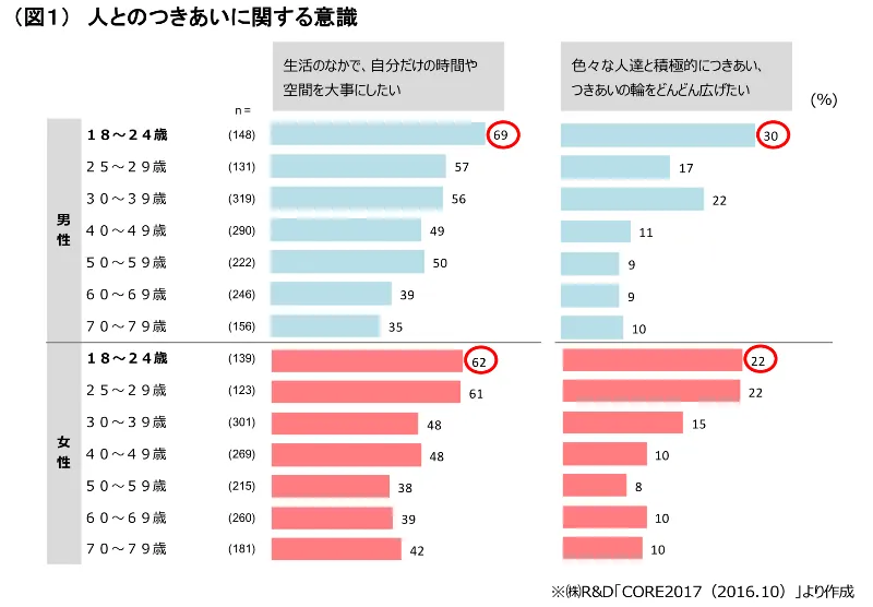 ・18~24歳の若者は、生活の意識として「自分だけの時間や空間を大事にしたい」が男女ともに6割を超え、他世代と比較して相対的に高い傾向にある。一方で、「色々な人達と積極的につきあい、つきあいの輪をどんどん広げたい」意識もあり、人とのつながりを大事にしたい意識もうかがえる。(図1)