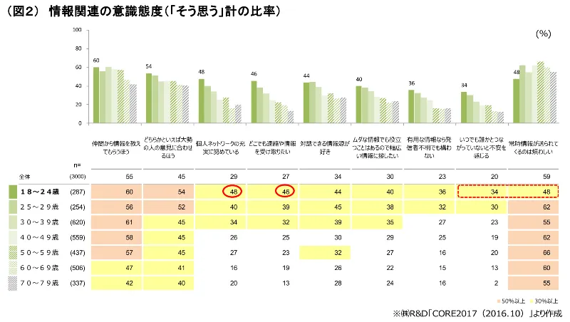 スマートフォンでいつでも、どこでも、誰とでもつながれる時代だからこそ、逆につながっていないことへの不安を感じる傾向が見受けられる。また、他者からの評価を意識し、他者に「いいね」をしてもらえないことに対する不安感を持つ者が多い傾向にある。生活には「自由さ」を求めているが、仲間同士の和を乱すことなく無難に楽しく過ごすことに重きをおいており、他者から非難を受けない許容範囲内での「自由」「自分らしさ」「楽しさ」を実践しているようにも感じられる。
