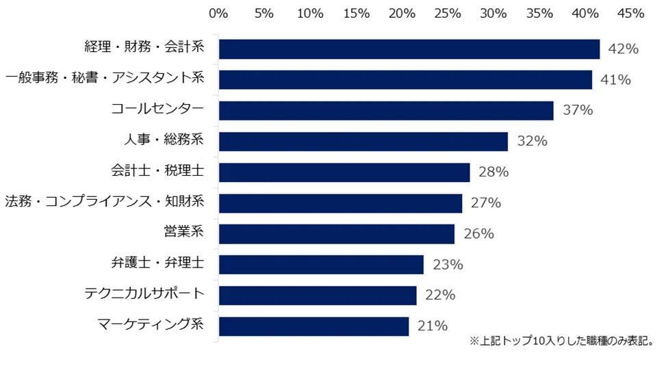 現在、ミドル世代が就業している職種の中で、AIに代替されて無くなると予想する職種を伺ったところ、多かった回答トップ3は「経理・財務・会計系」(42%)、「一般事務・秘書・アシスタント系」(41%)、「コールセンター」(37%)でした。いずれの職種でも「決まったことをする定型業務が多いため」という理由が多く見受けられました。