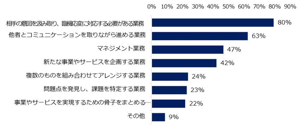 現在、ミドル世代が就業している職種の中で、AIに代替されないであろう職種を伺ったところ、もっとも多かった回答トップ3は「経営者・COO・経営幹部」(77%)、「経営企画・事業企画系」(46%)、「営業系」(38%)でした。AIに代替されず、無くならないと考えられる業務について伺うと、多かった回答トプ3は「相手の意図を汲み取り、臨機応変に対応する必要がある業務」(80%)、「他者とコミュニケーションを取りながら進める業務」(63%)、「マネジメント業務」(47%)でした。代替されないであろう職種に関連する項目が上位を占めました。各職種を選んだ方の具体的なコメントもご紹介します。