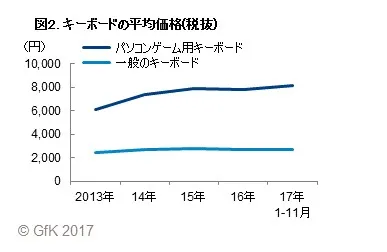 市場の2割弱を占めるゲーム用キーボードは、2017年(1-11月)で数量前年比33%増、金額前年比39%増となった。メカニカルスイッチ搭載キーボードが数量構成比 で5割、金額構成比で8割へ拡大するなど高機能化が進む。ゲーム用キーボードの税抜き平均価格は一般モデルの約3倍となる8,200円に上昇した(図2)。