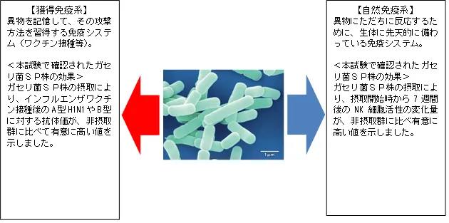 以上の結果から、ガセリ菌SP株の摂取は、獲得免疫系と自然免疫系の両方を増強することで生体防御機能を高めることが示唆されました。