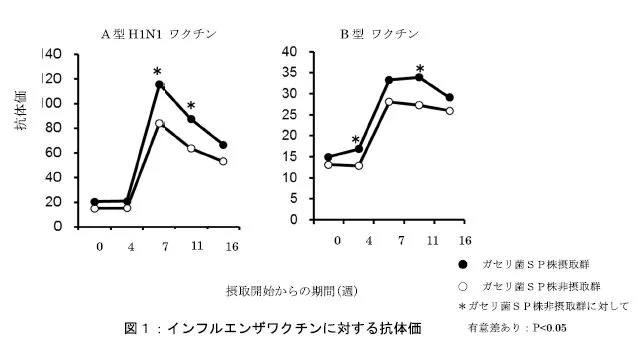 ガセリ菌SP株摂取群では、ワクチン接種後のA型H1N1およびB型に対する抗体価がガセリ菌SP株非摂取群に比べ有意に高い値を示しました。摂取開始時から7週間後のNK細胞活性と唾液中IgA濃度の変化量は、ガセリ菌SP株摂取群がガセリ菌SP株非摂取群よりも有意に高い値を示しました。以上の結果から、ガセリ菌SP株の摂取は、獲得免疫系と自然免疫系の両方を増強することで生体防御機能を高めることが示唆されました。