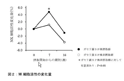 具体的には、ガセリ菌SP株は、ワクチン接種後のインフルエンザA型H1N1や同B型に対する抗体価(※3)を有意に向上させました(獲得免疫系の増強効果)(図1)。また、ガセリ菌SP株の摂取により、NK細胞活性の変化量(※4)が有意に高い値を示しました(自然免疫系の増強効果)(図2)。