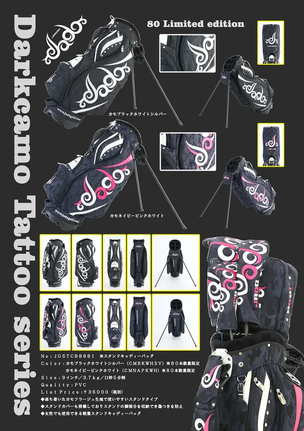 株式会社ビガーエス(所在地:福岡県太宰府市、代表取締役:古賀 勢朗)は、独自の邪道なデザインのゴルフ用品ブランド「JADO」より、『DarkcamoTattooシリーズ』を2017年12月23日から当社お得意先様のゴルフ専門店、中古ゴルフ店、インターネット販売店などのゴルフ店舗にて販売いたします。今回は「JADO」ブランドとして初の迷彩柄でのスタンドタイプのキャディーバッグ・ヘッドカバー各種を発売いたします。キャディーバッグは各カラー80本限定の販売となります。