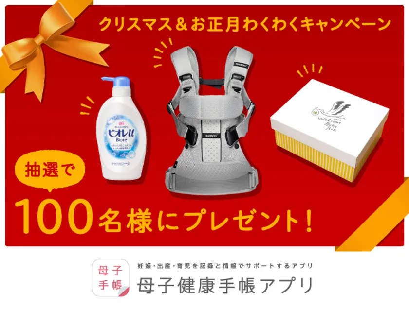 母子健康手帳アプリ(主催:特定非営利活動法人ひまわりの会(以下 ひまわりの会)、企画・開発・運用:株式会社NTTドコモ(以下 ドコモ)/株式会社博報堂DYメディアパートナーズ(以下 博報堂DYメディアパートナーズ))は、2017年12月15日より、日頃ご愛好いただいている妊婦さん・ママさんに感謝の気持ちを込めて、合計100名様に豪華賞品が当たる「クリスマス&お正月わくわくキャンペーン」を実施中です。