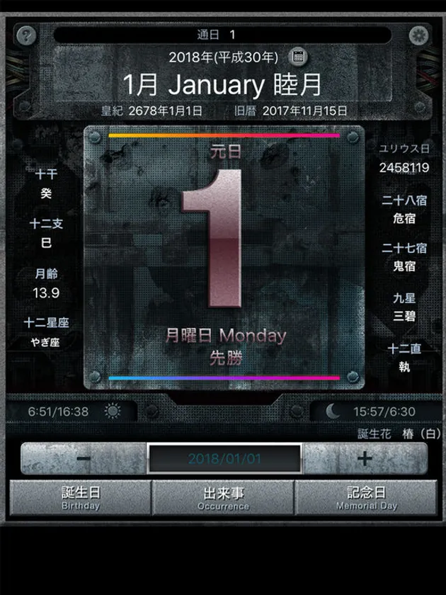 日めくりカレンダーの基本機能である、「その日に関する情報」も充実しています。通常の日付のほか、旧暦年月日、月齢、太陽や月の出入り時刻、六曜・九星・十二直・二十八宿などの暦注、その日が誕生日の有名人、過去の出来事、各種記念日の情報など、表示する日付に関する様々な情報を表示できます。