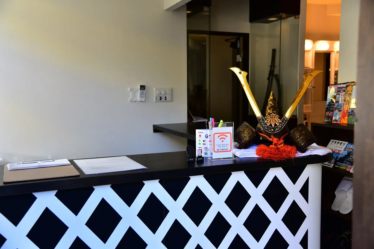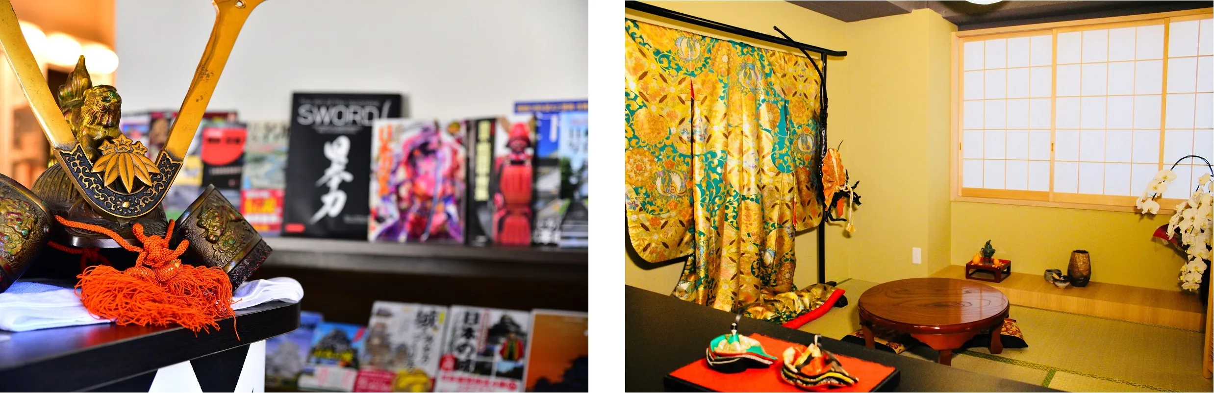 城をテーマにしたホステルで、城にまつわる書籍をはじめ、兜や刀、着物などを装飾。