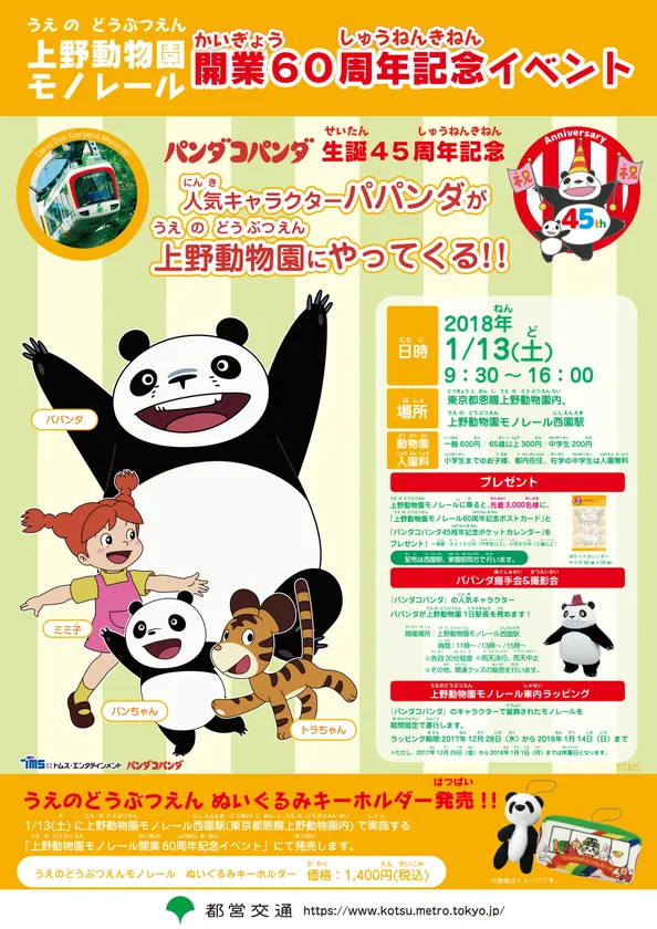 株式会社トムス・エンタテインメント(本社:東京都中野区 代表取締役社長:鈴木義治 以下 トムス)は、2017年に45周年を迎えた名作アニメ『パンダコパンダ』と、上野動物園内を走る「上野動物園モノレール」の開業60周年を記念して、2018年1月13日(土)にパンダコパンダの人気キャラクター“パパンダ”が一日駅長を務め、来場者をお迎えするイベントを開催いたします。